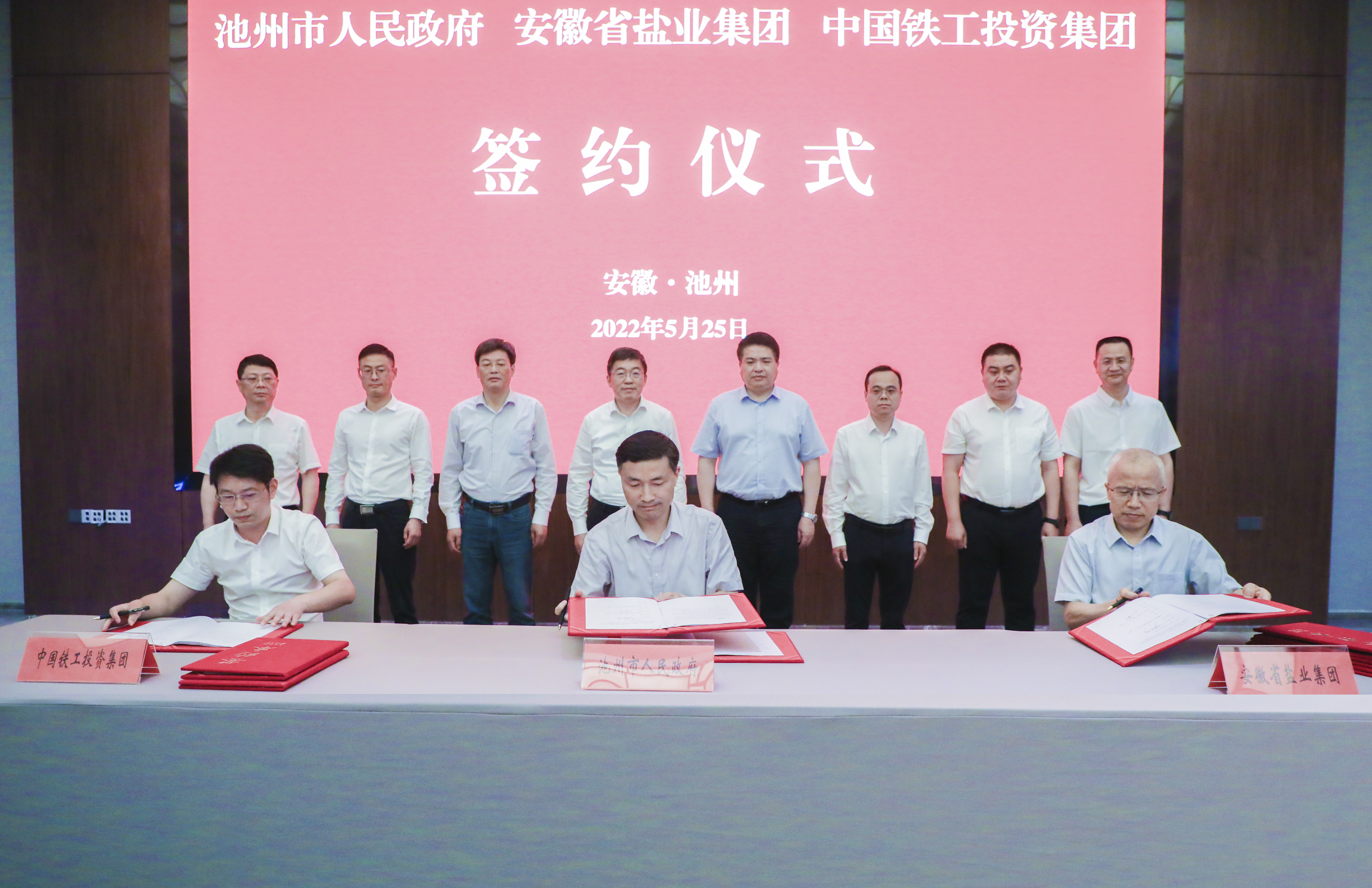 5月25日下午,省盐业集团、中国铁工投资集团与池州市政府举行工作座谈,并签署战略合作协议。省盐业集团党委书记、董事长罗太忠,池州市委副书记、市长朱浩东,中国铁工投资集团副总经理、投资总监兰书燕出席并见证签约。省盐业集团党委委员、副总经理余保山,池州市副市长胡军保,中国铁工投资集团华东区域总经理刘天明代表三方签订战略合作协议。