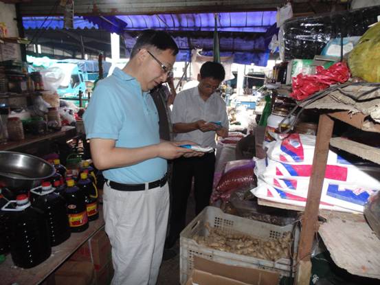 石俊一行在市公司领导及盐政人员陪同下,分别走访了黄山市黄龙农贸市场和铜陵市铜都大道上的商店,实地查看经销户的盐品种类、库存数量,了解商户需求,询问盐品配送、盐政稽查及有没有推销私盐等情况。