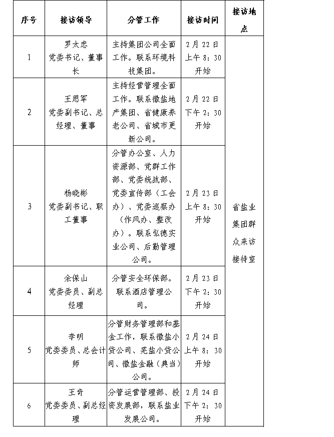 根据工作安排,现就省盐业集团领导班子成员2月份接待省盐业系统职工群众来访安排公示如下:
